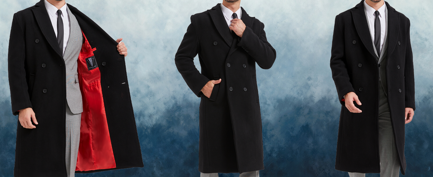 Black Double Breasted Wool Cashmere Long Overcoat Red Lining