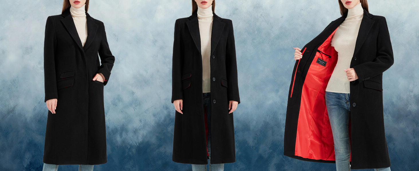 Black Double Breasted Wool Cashmere Long Overcoat Red Lining