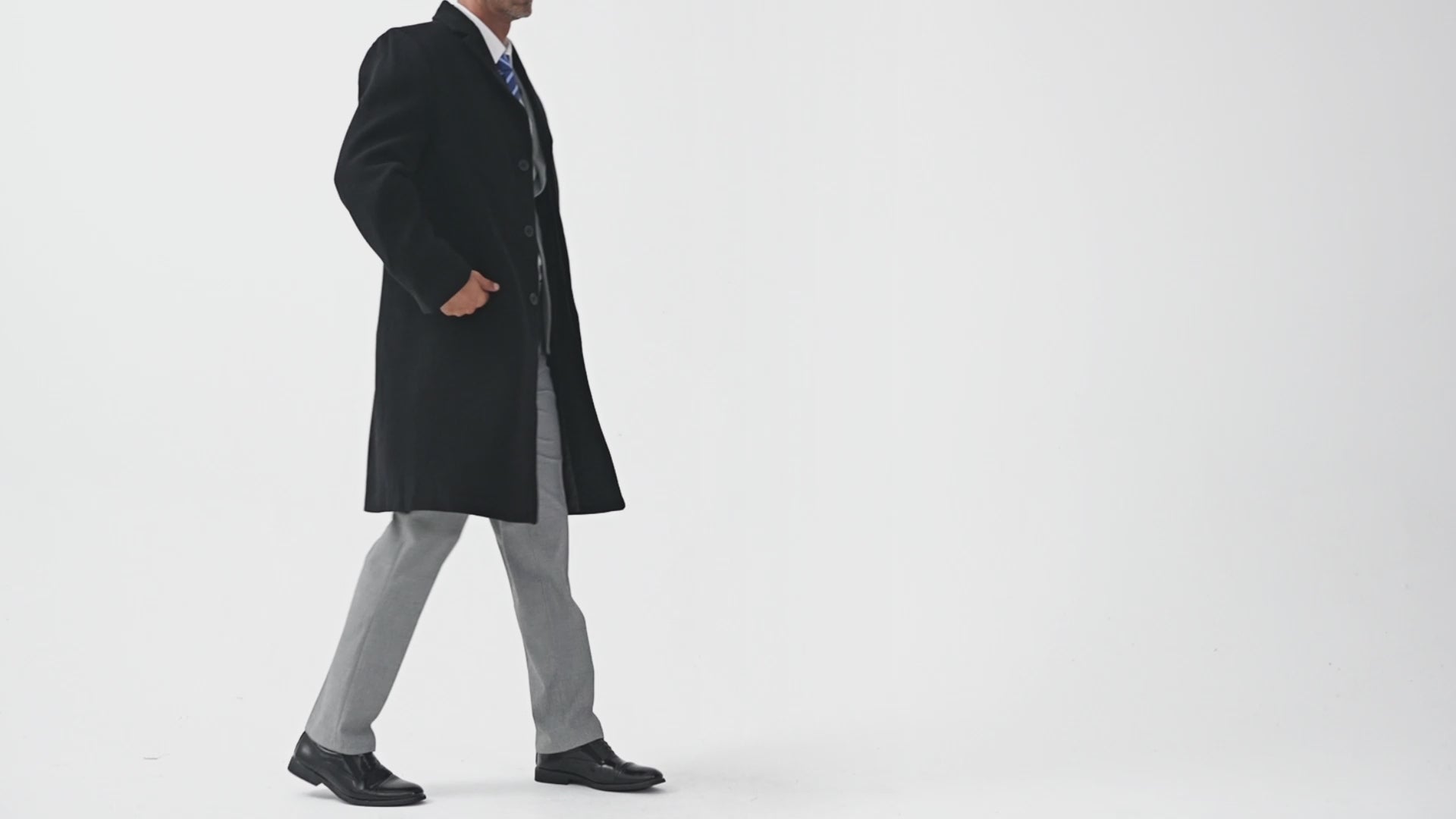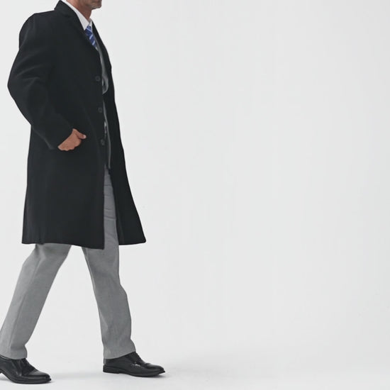 Men's Black Wool & Cashmere Bond Overcoat, the perfect winter Overcoat for style and warmth. This single-breasted coat features a hidden placket and a three-button fastening. It has two hip pockets and a centre vent at the back for ease of movement. The coat is fully lined with luxurious black satin and measures 42" from collar to hem.